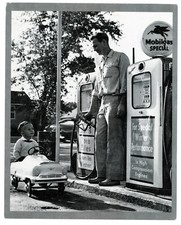 Vintage 1950’s 2 Sided Flying A Mobil Gas Station, Small Boy in Toy Car Photo