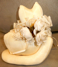 CAT SHAPED PILLOW DOLL 8" White Flowers ROSES LACE Stuffed Plush DECORATIVE VTG