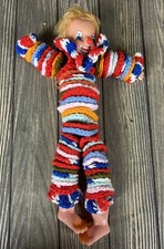 VTG Handmade CLOWN DOLL Knit Plush Toy Folk Art 70s 80s Multicolor Granny Decor