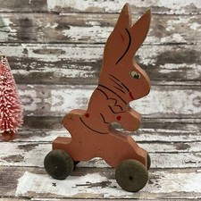 Vintage Easter Rabbit Bunny Pink Wood Push Toy 7in