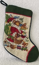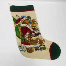Vintage Christmas Stocking Needlepoint Teddy Bear Santa Toys Tree Vintage Toy