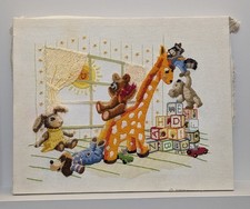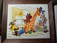 Vintage Completed Toy Room Needlepoint Framed 70s Nursery Children Dolls Blocks