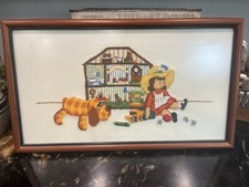 Vintage Framed Needlepoint Crewel Work Toys Dollhouse Doll Stuffed Dog