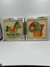 Vintage Framed Wall Art Handmade Needlework Decor Baby’s room Toys 5.75” Square
