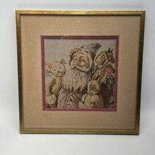 Vintage Framed Needlepoint Canvas Santa Carrying Stuffed Bear, Rabbit, And Toys