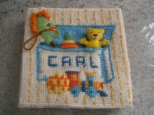 Vintage Finished Needlepoint Piece Toy Box Carl 5" x 5"