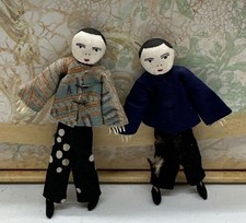 Pair of Antique Asian Wire Cloth Silk Dollhouse Dolls 3" Tall