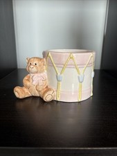 Vintage Teddy Bear And Drum Baby Planter Pink With Blue And Yellow Accents 3.5”