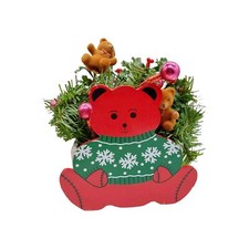 Vintage Wood Teddy Bear Planter Red Christmas Felt Mini Bears & Plastic Holly 6"