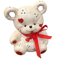 Vintage Teddy Bear Planter Ceramic 1980's Nursery Decor, White Polka Dot Hearts