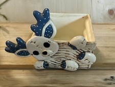 Vintage Handmade Clay Reindeer Planter Toy Dish Blue & White Cottage Christmas