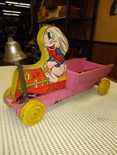 VTG Lithograph Gong Bell Mfg Bunny Rabbit Fire Truck Pull Toy Bell Rings Wooden