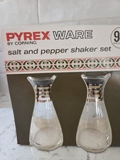 Vintage 70s PYREX Clear W Gold SALT & PEPPER Shaker SET Corning MID-CENTURY