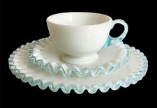 3 pc. Rare FENTON AQUA CREST MILK GLASS CUP + SAUCER + 8.5” PLATE COASTAL BEACH