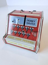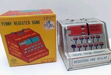 Vintage 1950 LINE MAR Toys PENNY REGISTER BANK Holds One Dollar w/ Box Metal Tin
