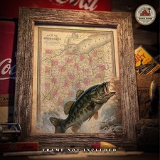 Bass Fishing Minnesota State Map Art Print Vintage Fish Lures Cabin Wall Decor