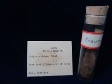 RARE ANTIQUE VINTAGE GLASS APOTHECARY BOTTLE DRUG STORE OLD LABEL RHEUM CONTENTS