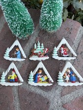 Vintage 6 Mid Century Plastic White Diorama Christmas Scene Ornaments Hong Kong