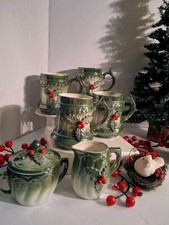 VTG 1960's Norcrest Green IRIDESCENT Lusterware;"Holly & Berries";Mugs Only;Mint