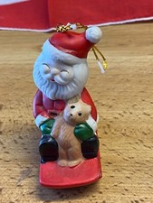 Vintage 1970s Porcelain Santa on Sled Christmas Ornament 3" Mid Century