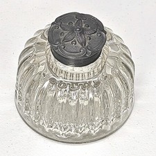 Antique Glass Fluted Inkwell Embossed Flower Lid Large Vintage Inkwell