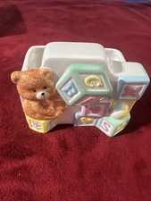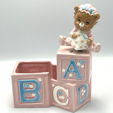Lefton Nursery Planter Music Box 04325 Baby Bear Alphabet Blocks Vintage 1984 9"
