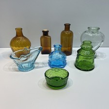 LOT OF 8 VINTAGE SMALL COLORED GLASS BOTTLES JAR COAL BUCKET SALT DISH