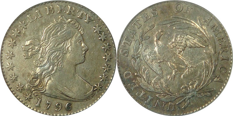 There are two types of the draped bust half dime. Plain Eagle Reverse (1796-1797),released in 1796, the coin's obverse design consists of a draped bust profile of Liberty facing right, with flowing hair secured by a ribbon. The word LIBERTY is above her head, and the date is below the bust. Stars flank each side. The 1796 half dime has eight stars on the left and seven on the right representing the fifteen states, including the new states of Vermont (#14) and Kentucky (#15). In 1797, a fifteen-star variety was struck, and later a sixteenth star (eight right, eight left) was added after Tennessee was admitted to the Union on June 1, 1796. Director DeSaussure's successor, Elias Boudinot, realized that they couldn't go on adding stars ad infinitum, so the last variety of 1797 had only thirteen stars (seven right, six left). From this time on, thirteen stars would be used to symbolize the union of states. The coin's reverse depicts an open wreath surrounding a small eagle that is perched on a cloud. The eagle is smaller than the one on the Flowing Hair design of 1794-95, but it has a fuller breast. The inscription UNITED STATES OF AMERICA surrounds the wreath.