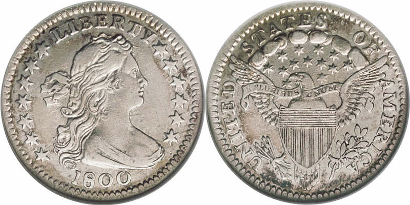 Scot's design for the Draped Bust/Heraldic Eagle half dime of 1800 was first used on the gold quarter eagles in 1796, the gold half eagle in 1797 and the dollars and dimes in 1798. It features a strengthened and more aesthetic rendering of Stuart's draped bust portrait of Liberty, her hair tied with a ribbon. The inscription LIBERTY appears above her head, and surrounding the bust are seven stars to the right and six to the left. The reverse depicts a large eagle with outstretched wingsthe Union Shield on his breastclutching thirteen arrows and an olive branch. His beak holds a ribbon inscribed with the Latin motto E PLURIBUS UNUM (One made up of many). Thirteen stars are above the eagle, with an arc of clouds above the stars. UNITED STATES OF AMERICA surrounds the periphery.